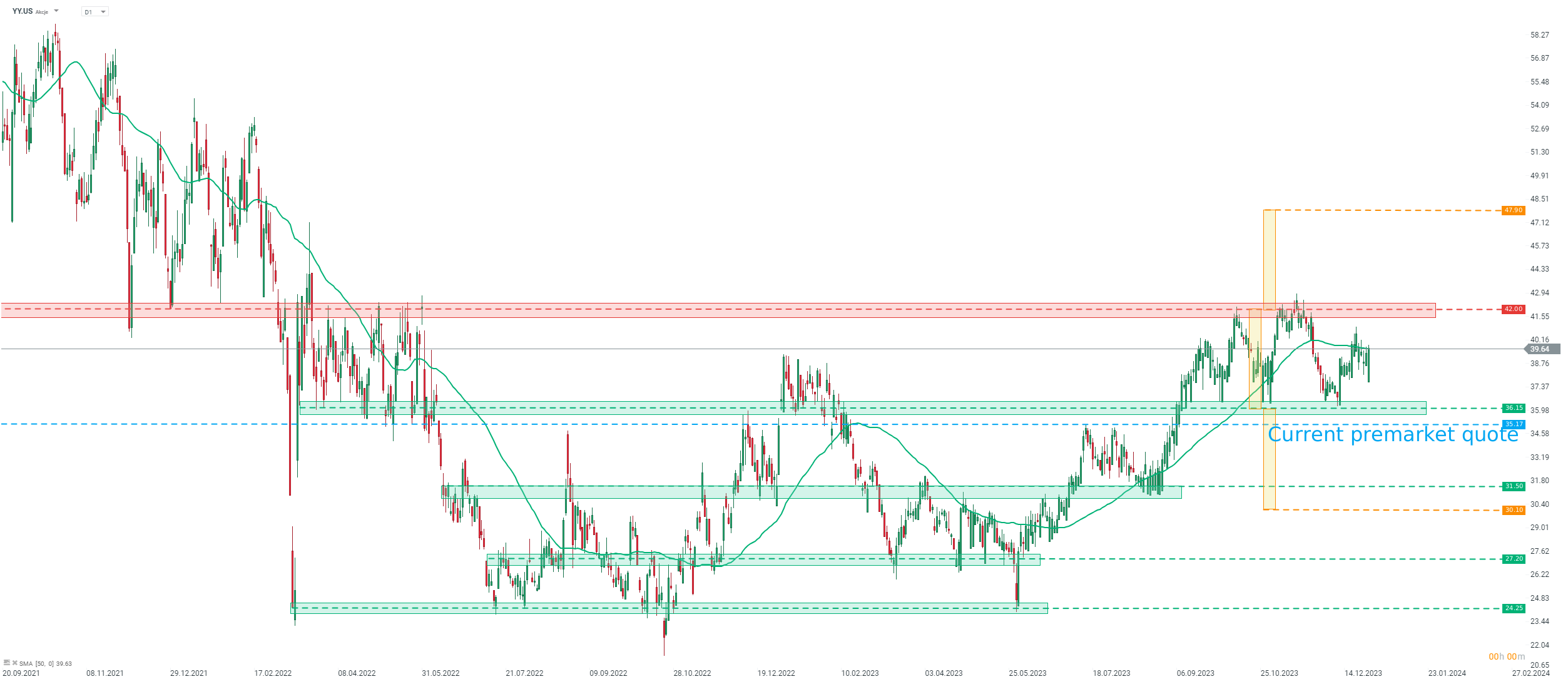 Le azioni JOYY (YY.US) hanno attualmente un prezzo di 35,17 dollari nel pre-mercato negli Stati Uniti, previsto in un calo di oltre l'11% al lancio della sessione cash di Wall Street. Dando un'occhiata al grafico nell'intervallo D1, possiamo vedere che il titolo dovrebbe aprire sotto il limite inferiore dell'intervallo di consolidamento in corso. Un movimento oltre questo ostacolo suggerisce la possibilità di un movimento al ribasso maggiore, con un range pari a $ 30,10.
