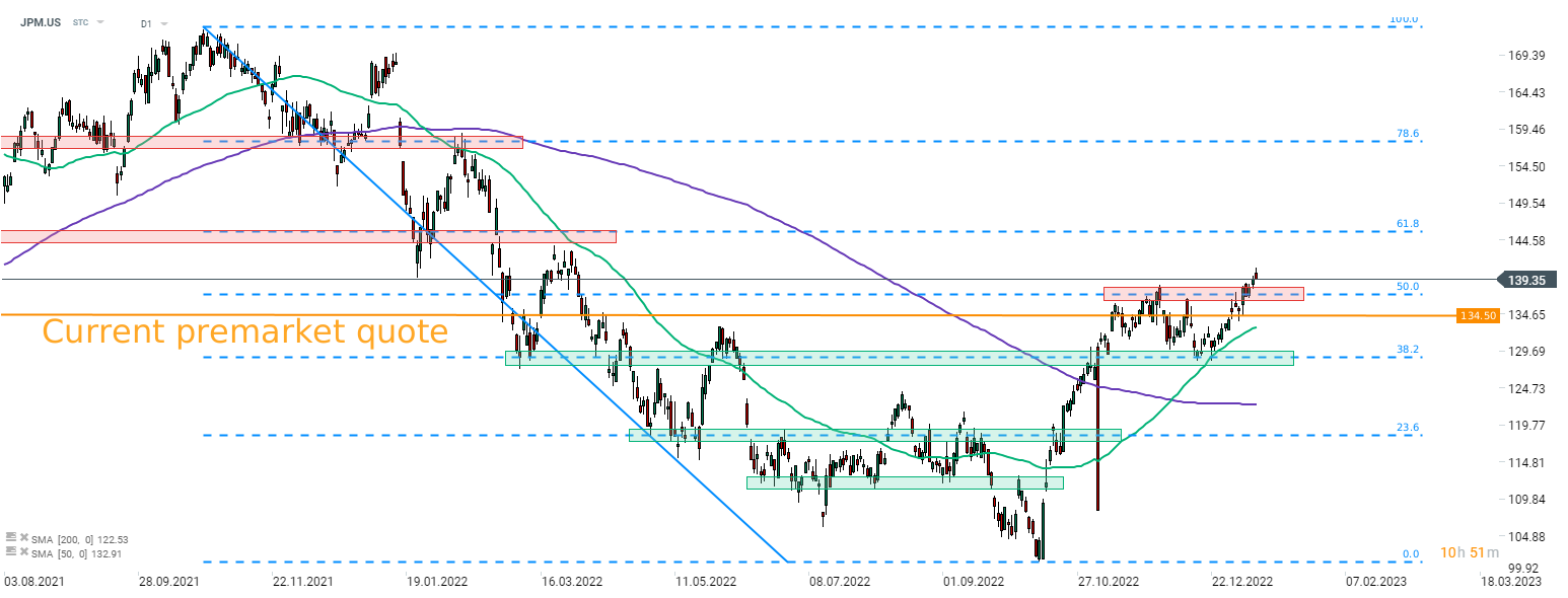 Secondo le attuali quotazioni pre-mercato, JPMorgan (JPM.US) inizierà la sessione di trading cash di oggi con un gap di prezzo ribassista. Il titolo potrebbe aprire leggermente al di sotto di una zona di resistenza recentemente superata contrassegnata dal 50% del ritracciamento dell'impulso al ribasso iniziato a fine ottobre 2021. Se dovesse continuare il sentimento negativo, non si può escludere un pullback verso la zona di supporto al 38,2% del ritracciamento (area $ 128,50).