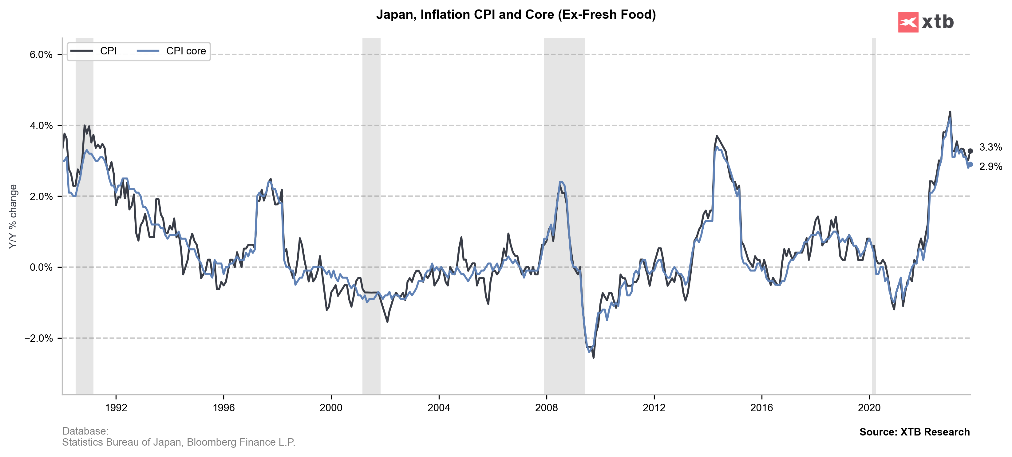 L’inflazione CPI è salita al di sopra dell’obiettivo del 2% della BoJ, ma se questo aumento della crescita dei prezzi sarà sostenuto non sembra chiaro. Fonte: Bloomberg Finance LP, XTB Research