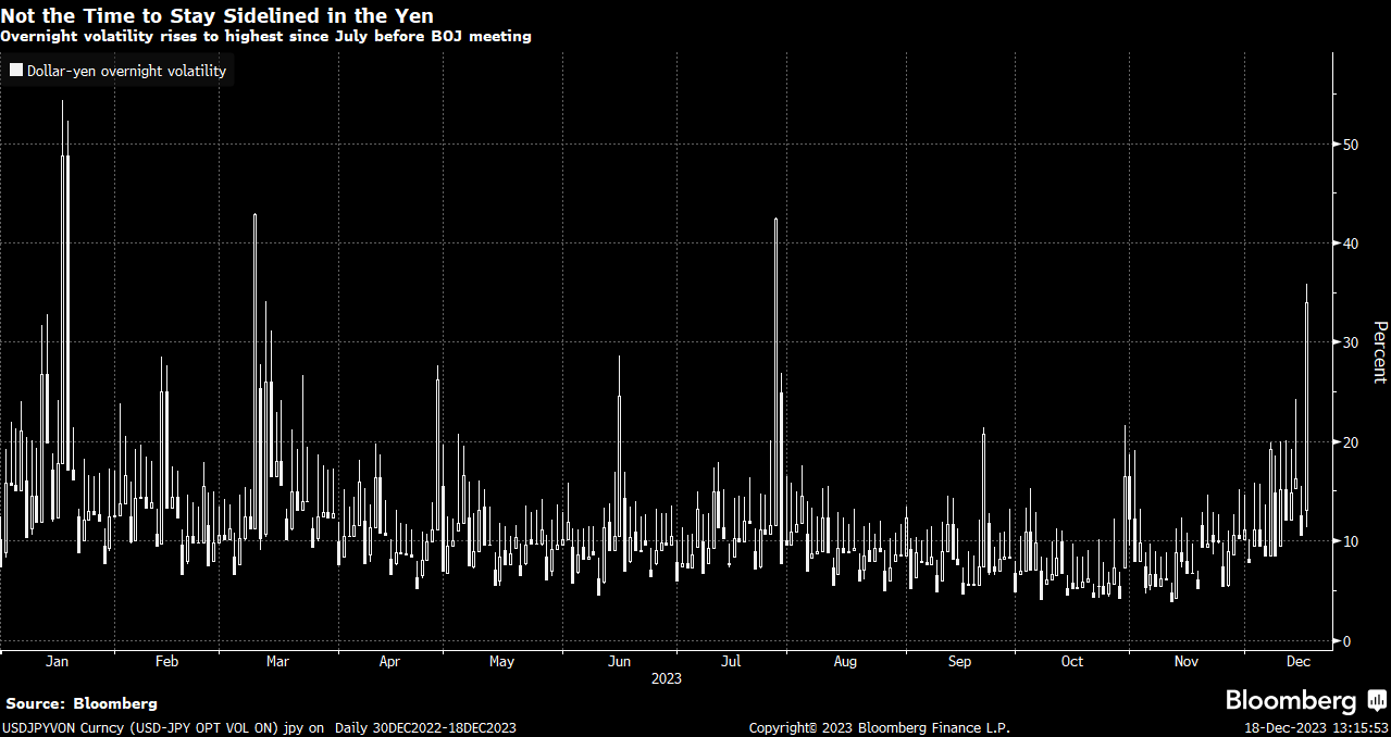La continua debolezza dello yen ha indotto alcune banche centrali a intervenire quest’anno e la valuta ha iniziato a riprendersi quando i funzionari della BoJ hanno accennato alla possibilità di una fine dei tassi negativi entro la fine del 2023. Ancora all’inizio di dicembre 2023, il vicegovernatore della BoJ Himion ha ipotizzato in un discorso sugli effetti che una fine dei tassi negativi avrebbe sull’economia giapponese, alimentando le speranze che tale mossa sia imminente. Tuttavia, circa una settimana dopo, sono emersi resoconti dei media secondo i quali la BoJ non sarebbe disposta ad aumentare i tassi in occasione della riunione finale di quest'anno.