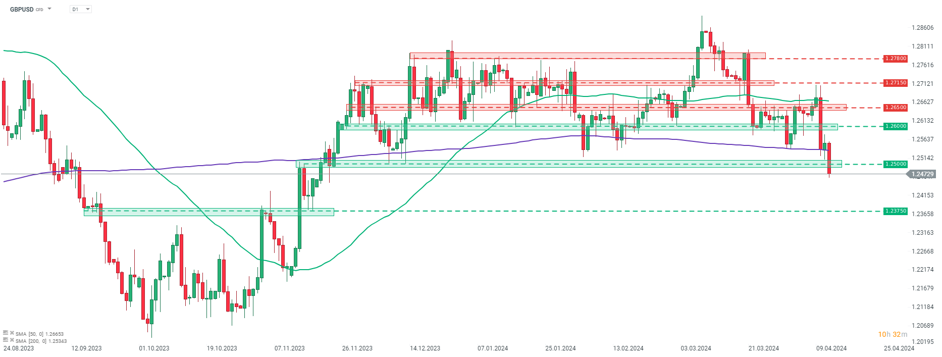 Dando uno sguardo al grafico GBPUSD nell'intervallo D1, possiamo vedere che la coppia è crollata al di sotto della media mobile della sessione 200 oggi (linea viola), che ha agito da supporto durante il movimento laterale lungo 4 mesi. I cali si sono accelerati in seguito e la coppia è crollata anche al di sotto della zona di supporto di 1,25, raggiungendo il livello più basso dal 22 novembre 2023. La prossima grande zona di supporto da tenere d'occhio si trova intorno al livello di 1,2375 ed è contrassegnata dalle precedenti reazioni dei prezzi.