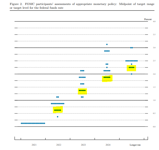 Non si tratta solo di raddoppiare il taper. La mediana vede 3 aumenti nel 2022 e altri 3 nel 2023. Questo è più di quanto i mercati si aspettano, ma tieni presente che il punto di Powell è probabilmente inferiore alla mediana (la nostra ipotesi è in giallo).