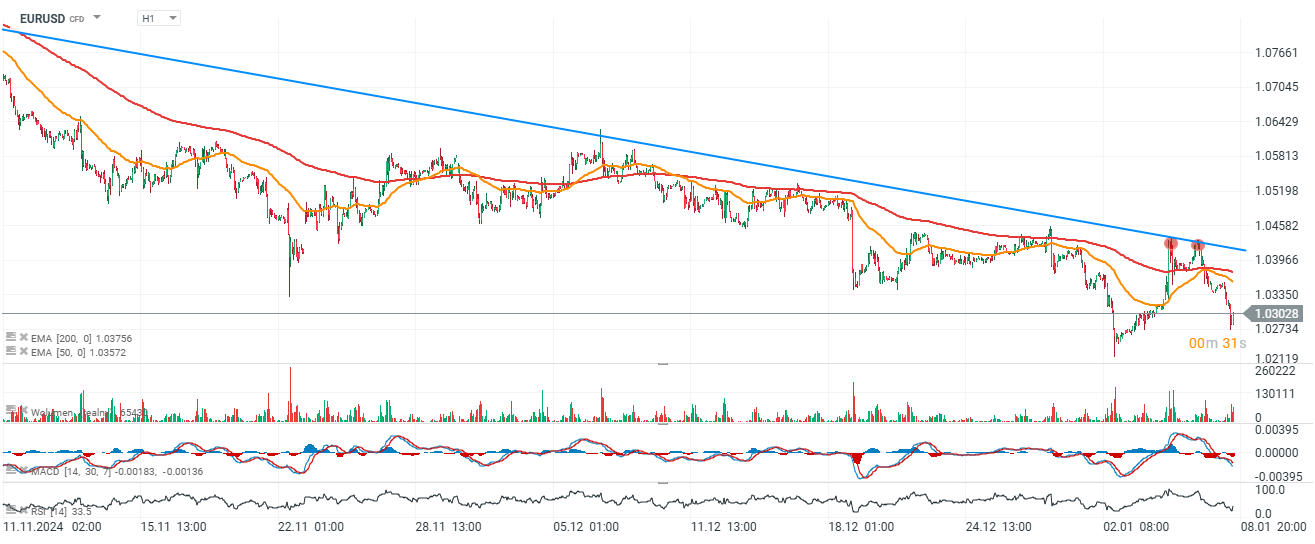 EURUSD è ancora in calo dello 0,4% oggi; tuttavia, i rendimenti dei titoli del Tesoro USA sono scesi dal 4,72% al 4,68% dopo i dati macroeconomici di oggi e le dichiarazioni piuttosto dovish di Waller. La coppia è anche sotto pressione a causa di deboli dati macroeconomici provenienti dalla Germania.