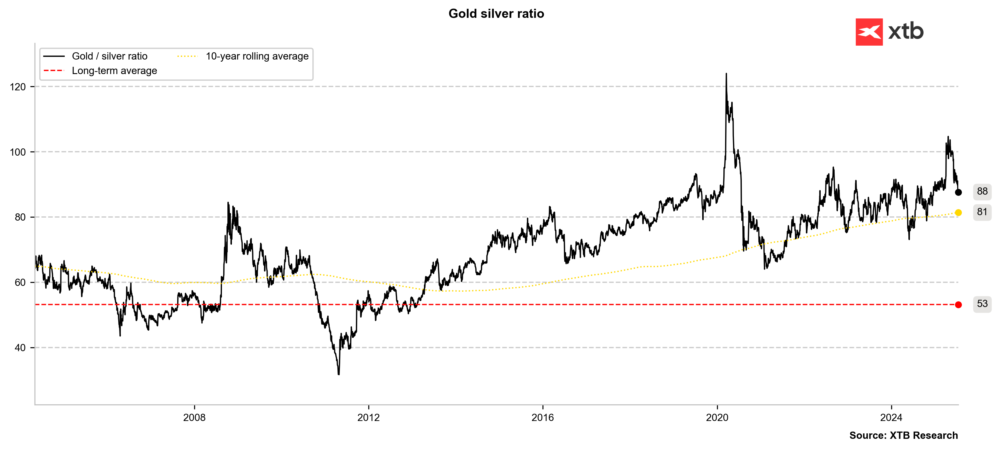 La media decennale di questo rapporto si aggira intorno a 80 — il che implicherebbe un prezzo dell’argento di circa 41,25 $/oz con l’oro attorno ai 3.300 $. Considerando la media storica di lungo termine, pari a 53, il prezzo dell’argento potrebbe teoricamente avvicinarsi ai 62 $/oz, ipotizzando prezzi dell’oro stabili.