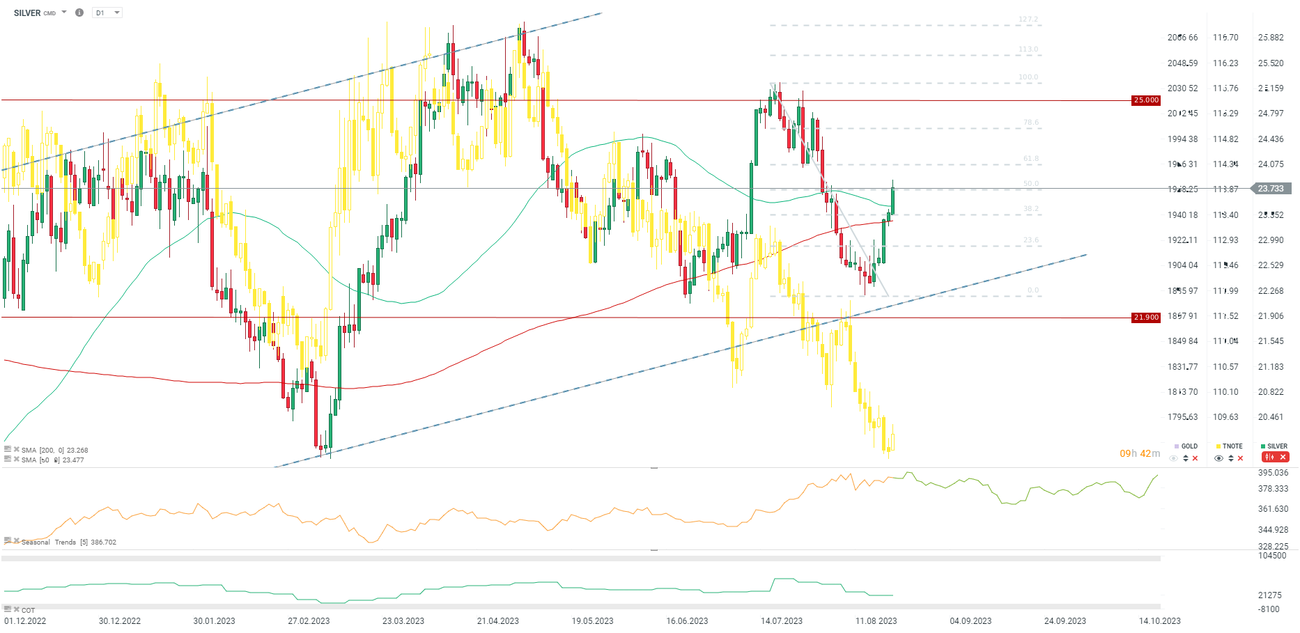 Ci sono state molte speculazioni su una possibile fine del ciclo di rialzi dei tassi non solo negli Stati Uniti ma anche nell’area euro. Sebbene i rendimenti obbligazionari rimangano elevati, oggi possiamo osservare un piccolo calo dei tassi di mercato. Nel frattempo, l'argento ha goduto di un forte movimento al rialzo che ha portato a un movimento oltre il 50% del ritracciamento dell'ultimo impulso al ribasso. L'argento è rimbalzato dall'area 22,20 - un minimo locale da giugno - e ora viene scambiato quasi a 24 dollari l'oncia - sopra la media mobile a 50 e 200 sessioni. Va notato che l'argento è stata una delle materie prime con la performance migliore nel corso degli ultimi 12 mesi, ma allo stesso tempo viene scambiata in leggero ribasso da inizio anno.