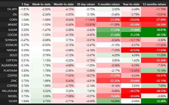 L'argento è la merce con la migliore performance questa settimana e una delle migliori performance degli ultimi 12 mesi. Fonte: ricerca XTB