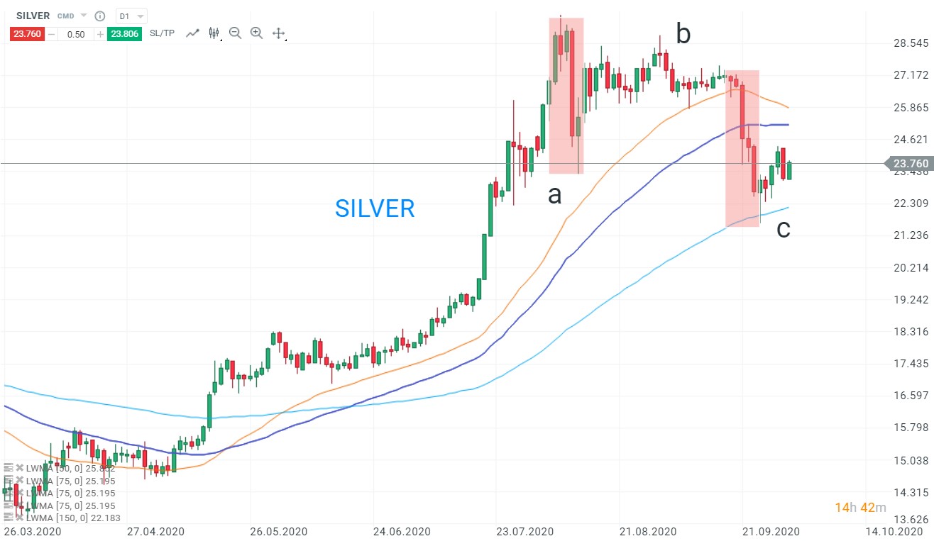 I prezzi dell'argento hanno avuto un anno fantastico, salendo di oltre il 30% dall'inizio di quest'anno, nonostante le recenti vendite. I prezzi erano vicini a $ 30 / oz all'inizio di agosto, ma sono scivolati a $ 22,50 quando il dollaro USA ha recuperato terreno. Fondamentalmente, alcuni livelli chiave di supporto sono stati difesi. In primo luogo, i rialzisti sembrano utilizzare la media mobile a 150 giorni come supporto e, cosa ancora più importante, i ribassi si sono fermati al rapporto 1: 1 tra le onde "a" e "c". Significa la fine dei guai per il metallo prezioso?
