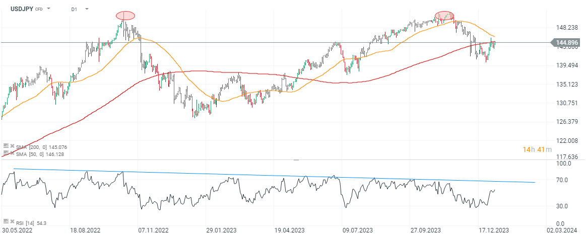 Sul grafico vediamo una formazione di doppio massimo ribassista vicino a 150, ma sta cercando di testare la media mobile semplice (SMA200, linea rossa). Il superamento del livello 145 potrebbe indicare una continuazione del trend ribassista dello JPY e un rafforzamento dell'USD/JPY, che oggi sta guadagnando più dello 0,4%.