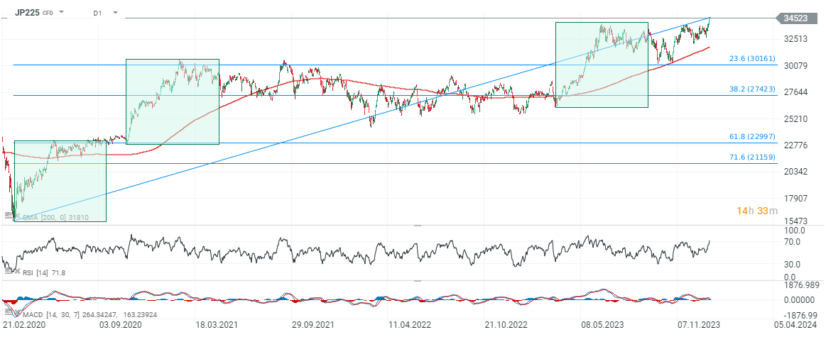 Se la dimensione del precedente impulso al rialzo (quadrati verdi) rimane e continua 1:1, non è escluso un aumento fino a circa 37.000 punti. L'indice ha mantenuto il supporto alla SMA200, che segna ancora il trend rialzista (attualmente intorno ai 32.000 punti).