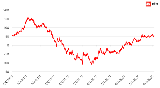 Differenza tra i rendimenti dei Treasury USA a 2 e 10 anni. Fonte: XTB