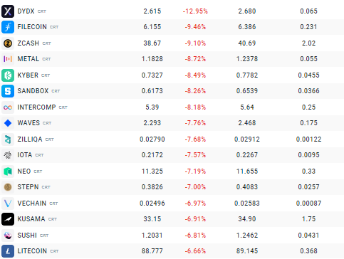 La stragrande maggioranza degli altcoin sta registrando un calo significativo. Filecoin e DYDX stanno perdendo di più. Fonte: xStation5