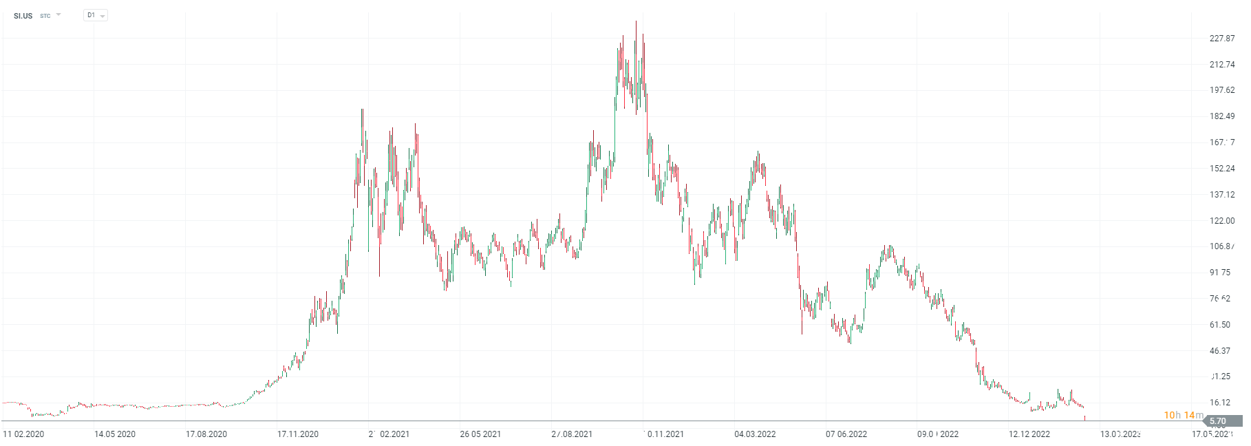 Il prezzo delle azioni di Silvergate Capital (SI.US) è attualmente ai minimi storici. Fonte: grafico xStation5