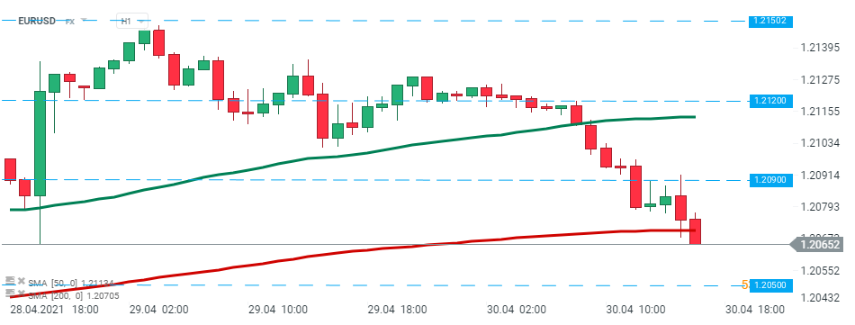 EURUSD è sceso dopo la pubblicazione dei dati di oggi e si sta dirigendo verso il prossimo supporto a 1,2050. Fonte: xStation5