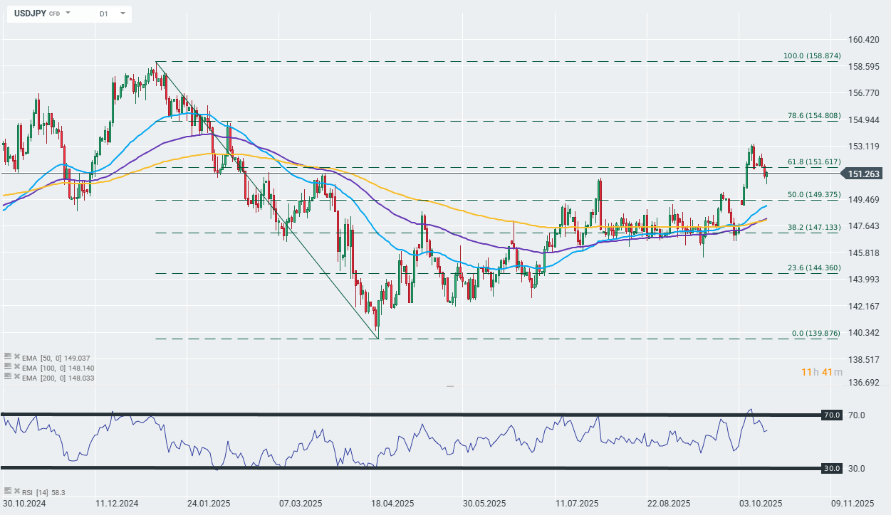 Dal punto di vista tecnico, l’USD/JPY resta in un trend rialzista di medio termine nonostante una breve onda correttiva al ribasso. Il livello di supporto più importante rimane la EMA a 50 giorni (curva blu sul grafico) e l’area dei recenti minimi multipli nella zona di consolidamento vicino a 147 yen per dollaro. Al contrario, il livello di resistenza più rilevante resta il picco locale del 10 ottobre. Fonte: xStation
