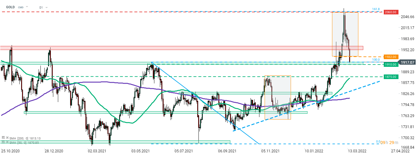 L'oro è sceso al di sotto di un livello di supporto importante a breve termine nell'area di $ 1.932, in seguito al rilascio del rapporto PPI statunitense di febbraio. I dati hanno mostrato che la crescita dei prezzi dei produttori principali è rimasta invariata al 10,0% a/a a febbraio, in linea con le aspettative del mercato. Il Core PPI ha decelerato dall'8,5 all'8,4% a/a mentre il mercato prevedeva un'accelerazione all'8,7% a/a. Il rilascio dei dati ha avuto un impatto limitato sul mercato e su USD. Tuttavia, si sarebbero potute notare reazioni molto più grandi sul mercato dell'oro. Il metallo prezioso è stato in calo per tutto il giorno, ma il movimento al ribasso è accelerato dopo il rilascio dei dati PPI statunitensi. Di conseguenza, il prezzo dell'oro ha superato un supporto importante a breve termine a $ 1.932 l'oncia, il limite inferiore di una geometria del mercato locale. Tale movimento suggerisce che la tendenza a breve termine potrebbe essersi invertita e che si sta profilando un calo maggiore. Il prezzo sta attualmente testando il supporto nell'area di $ 1.910 che stava limitando i movimenti al rialzo prima che il prezzo dell'oro salisse a fine febbraio 2022. Superare questo ostacolo potrebbe portare a un test dell'area di $ 1.875, dove si trova la linea di tendenza al rialzo a breve termine e si possono trovare precedenti reazioni del prezzo.