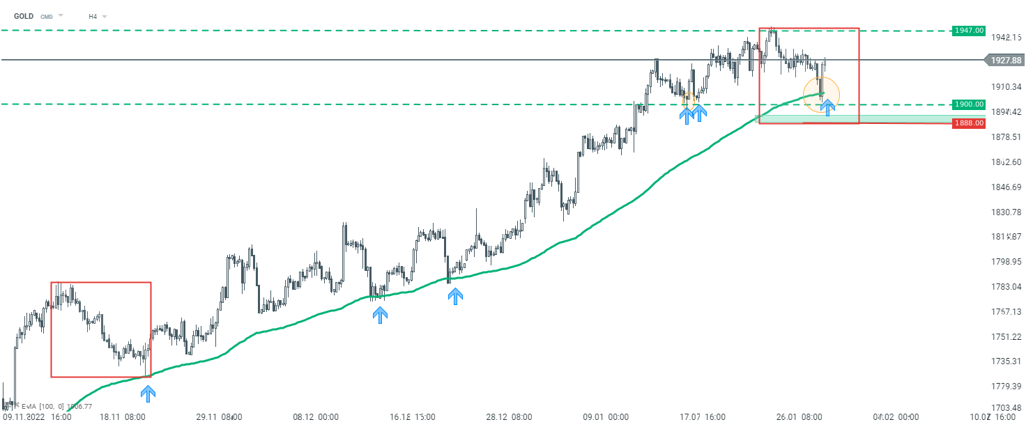Da un punto di vista tecnico, il prezzo non è riuscito a raggiungere un importante supporto a 1900 dollari poiché è rimbalzato dalla 100 EMA. Secondo le regole classiche dell'analisi tecnica, un rimbalzo da questa zona indica la continuazione del trend rialzista e apre la strada verso massimi a 1947 dollari. Se invece la situazione dovesse cambiare, oltre alla media, si dovrebbe prestare particolare attenzione al supporto a 1888 $, che è contrassegnato dal limite inferiore della struttura 1:1. Se venisse superata indicherebbe che il sentimento del mercato è diventato ribassista.