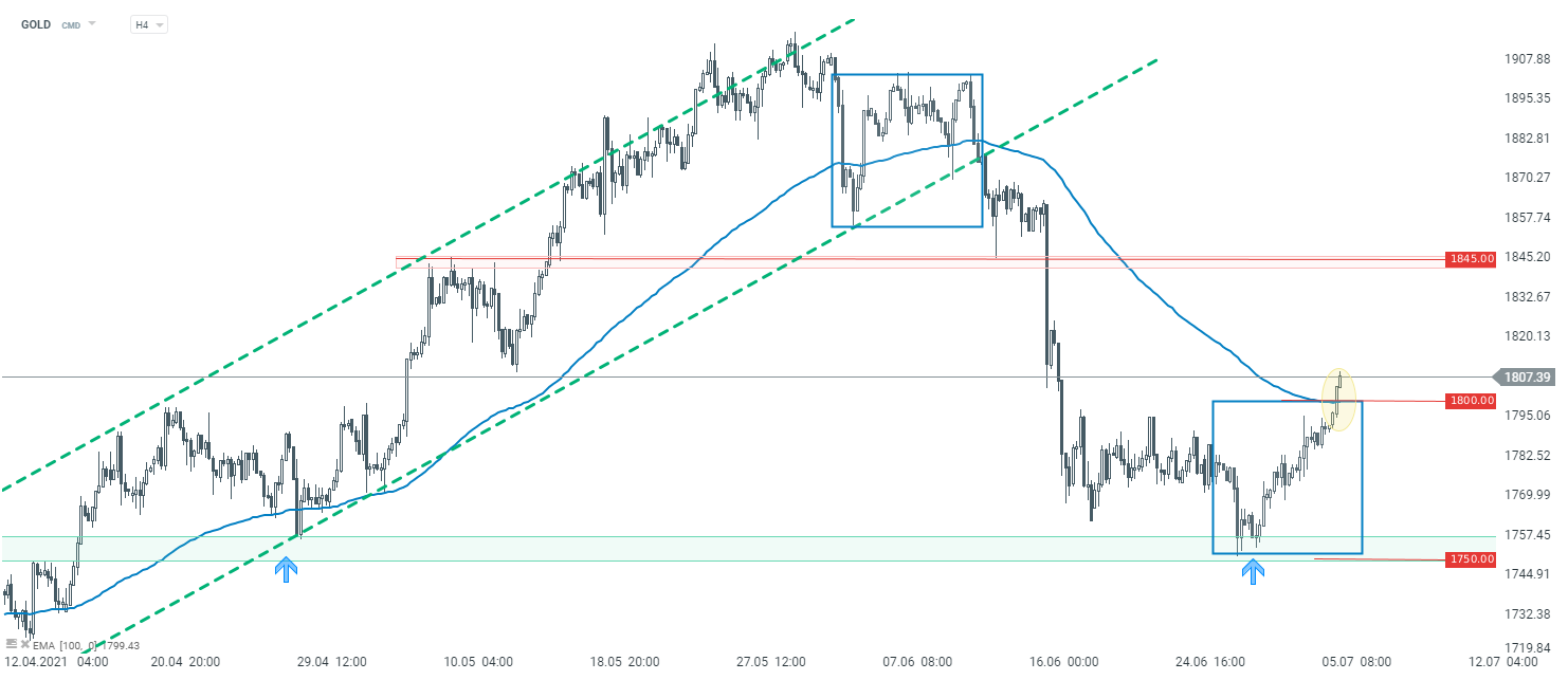 I metalli preziosi sono in rialzo oggi con l'oro che ha superato il livello psicologico di $ 1.800. Il dollaro USA è la più debole tra le valute del G10 e fornisce supporto per una serie di materie prime, compresi i metalli preziosi. Il prezzo ha superato il limite superiore della struttura Overbalance e l'EMA a 100 periodi (H4) nell'area di $ 1.800, segnalando che la correzione al rialzo in corso potrebbe diventare un'inversione di tendenza. La prossima resistenza da tenere d'occhio si trova nell'area di $ 1.845.