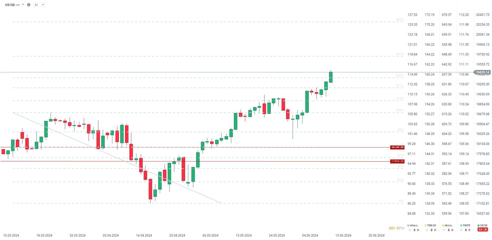Il dollaro si sta indebolendo, i rendimenti stanno diminuendo, il che ovviamente favorisce nuovi record sui contratti futures a Wall Street. L’indice US100 è già in rialzo di quasi l’1%, e sarà necessario solo un ulteriore movimento del 3% per raggiungere il livello di 20.000 punti. Fonte: xStation5