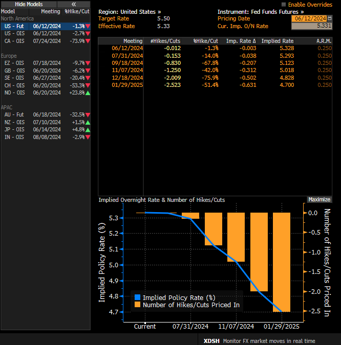 La probabilità di tagli dei tassi aumenta in modo significativo. Per settembre sale a quasi il 70% e, nel complesso, è già superiore all'80%. Per novembre sono previsti tagli di 1,25, mentre per quest'anno due tagli completi. Tuttavia, è importante ricordare che la situazione potrebbe cambiare durante la riunione di oggi, ma la Fed ha sicuramente motivo di essere soddisfatta. Se i prossimi due dati sull’inflazione saranno simili, settembre dovrebbe essere una data certa per il primo taglio. Fonte: Bloomberg Finance LP, XTB