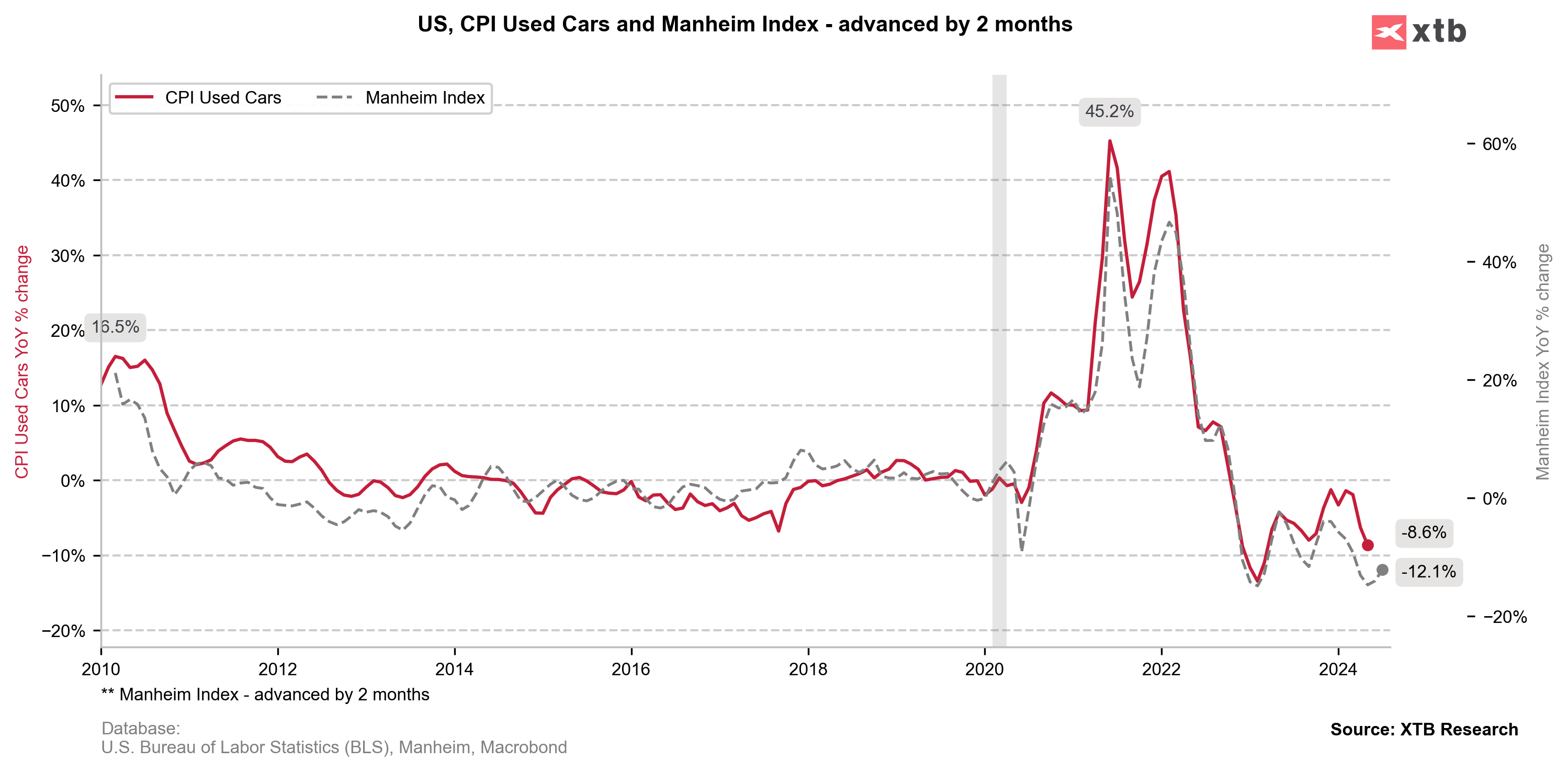 Se si considerano i dati su base annua, l’inflazione degli affitti continua a fornire il contributo maggiore, anche se la sua quota sta gradualmente diminuendo. Tuttavia, vale la pena notare che senza il calo dei prezzi delle automobili, probabilmente non avremmo assistito a una diminuzione dell'inflazione complessiva al 3,3% e dell'inflazione core al 3,4%. Fonte: Macrobond, XTB