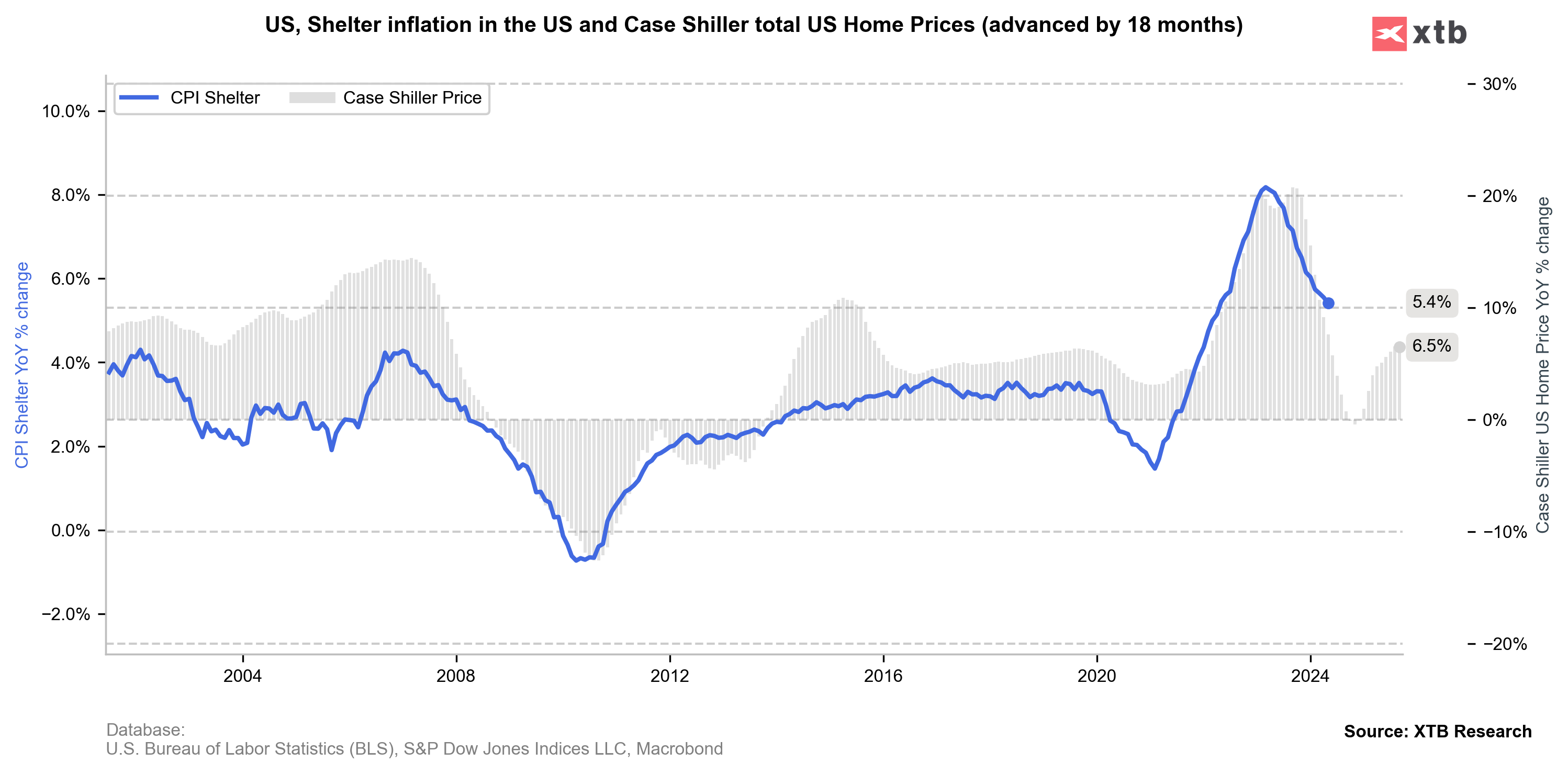 In teoria, la Fed non dovrebbe avere motivi di soddisfazione guardando il grafico dell'inflazione dei servizi. Rimane elevato, anche se si nota un leggero rallentamento rispetto alla lettura precedente, e i servizi esclusi gli affitti hanno registrato un aumento minimo al 5%. Fonte: Macrobond, XTB