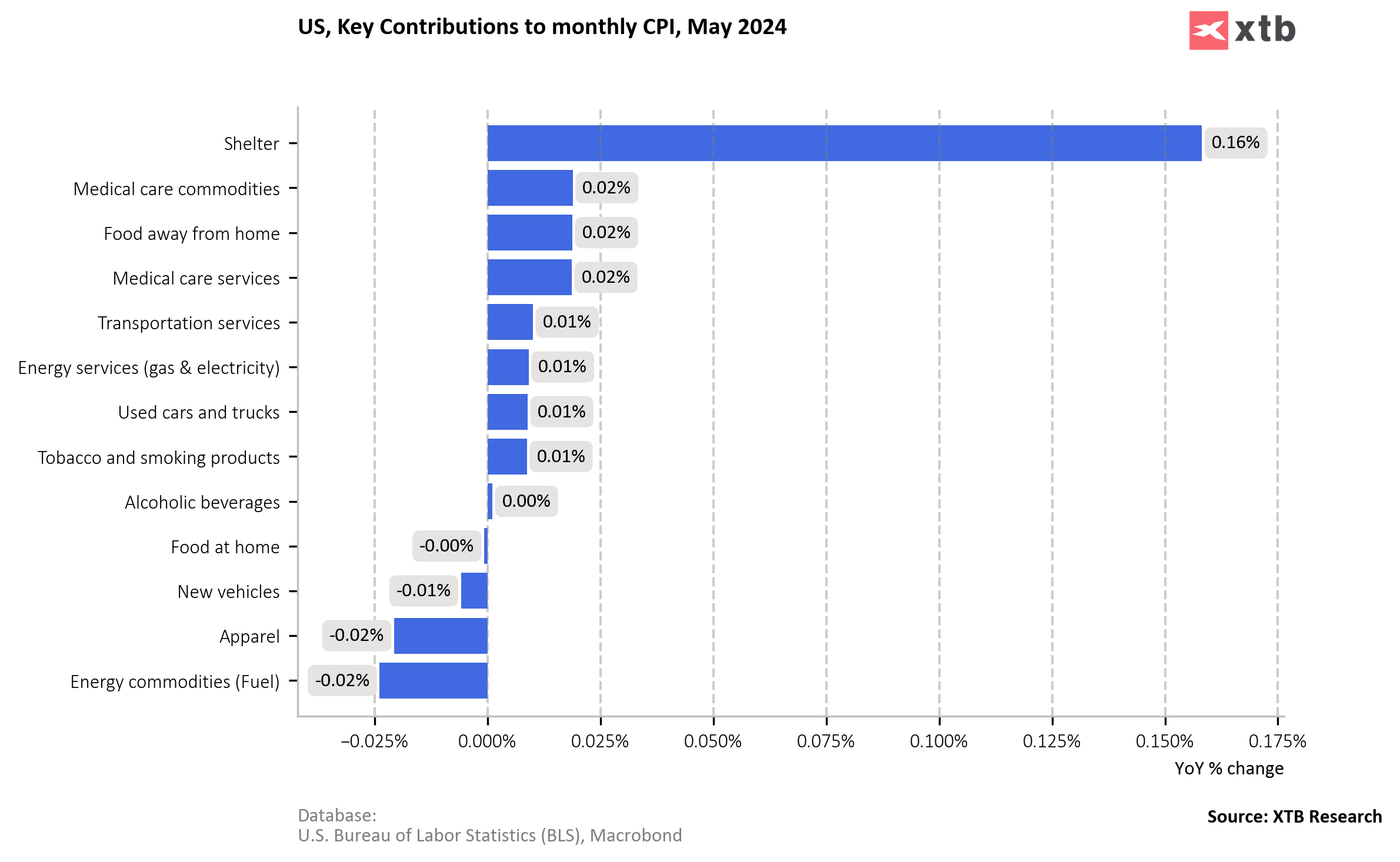 L'inflazione mensile è rimasta invariata, ma vale la pena notare che l'aumento più significativo si registra ancora nell'inflazione legata agli affitti. Tra le componenti chiave dell'inflazione spicca il carburante, poiché ha contribuito maggiormente alla riduzione del dato sull'inflazione. Fonte: Macrobond, XTB