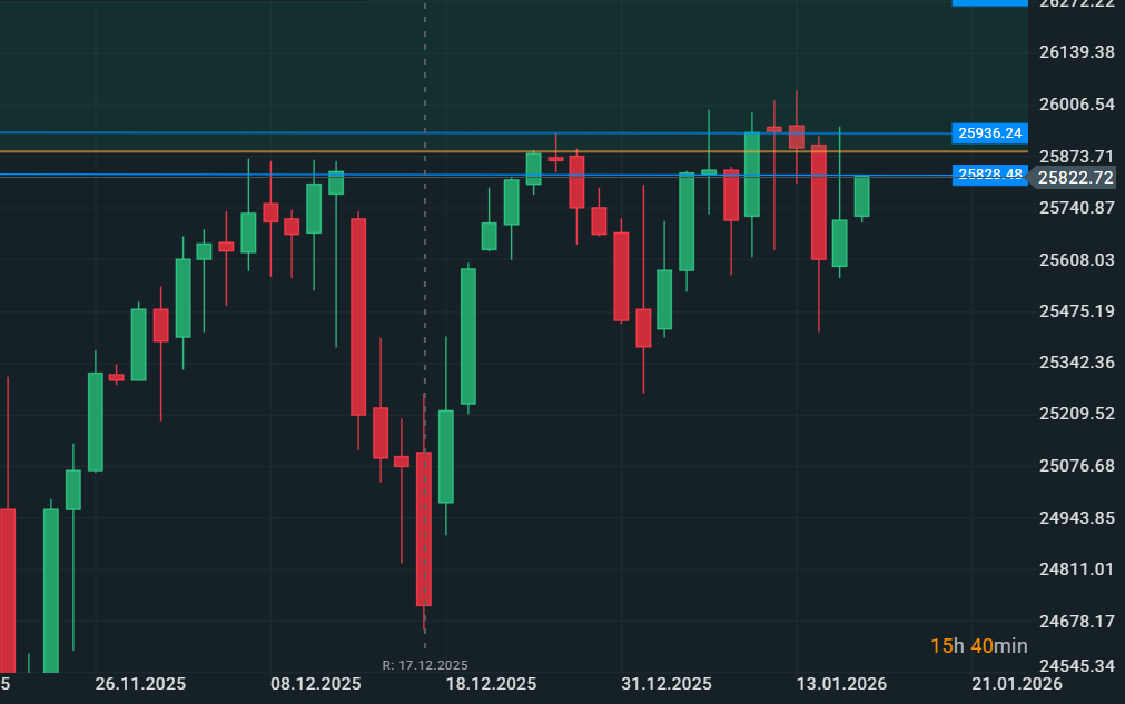 I tentativi di ribasso ci sono stati soprattutto in Usa, tentativi che non sono andati a buon fine, soprattutto per il Nasdaq che sembrava promettente per un sano ritracciamento. Nasdaq infatti si presenta come il mercato azionario piú debole dal punto di vista tecnico in quanto la sua dinamica giornaliera vede diverse giornate consecutive con massimi venduti sempre sugli stessi livelli, ossia area 25900-26000. Quest'area é stata utilizzata per vendere mercoledí e provare l'allungo al ribasso, un allungo che non si é trasformato in un movimento consistente, bensí in un movimento che é tornato sui minimi settimanali dai quali stiamo vedendo un rimbalzo. La dinamica dei prezzi rimane ancora in fase di test dei massimi, pertanto la situazione tecnica risulta ancora molto dubbia dal punto di vista dei rialzi. Nasdaq potrebbe sorprendere nel corso delle prossime settimane con l'uscita delle trimestrali delle Big5 (o Mag7).