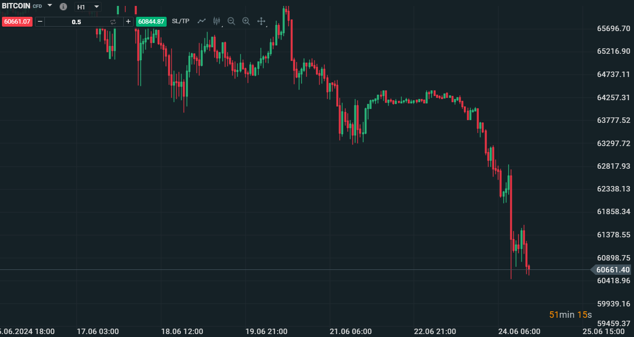 Il ribasso di Bitcoin su base H1 che porta i prezzi a ridosso dei 60000 dollari - Fonte:XStation