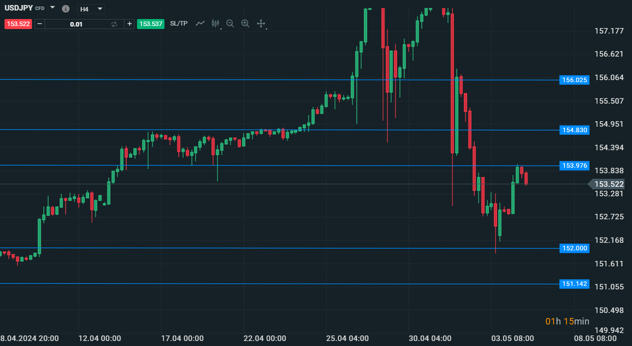 Il grafico di UsdJpy si presenta come marcatamente ribassista su timeframe 4 ore, uno dei timeframe fondamentali per un'operativitá di tipo intraday e multiday (all'interno della settimana). Come possiamo notare, da area 152 abbiamo visto un forte recupero, un recupero fisiologico dopo il crollo della scorsa settimana, ma la dinamica rimane profondamente ribassista. Vista la dinamica attuale, ogni livello importante sul grafico, ossia quei livelli che hanno fatto supporto o resistenza, potrebbero essere livelli di reazione per poi intraprendere ulteriori allunghi a favore del nuovo trend ribassista. Al momento in mattinata abbiamo visto il test di area 154 con il tentativo di allungo al rialzo da area 153,70 fallito piú volte nel corso della sessione europea. Attenzione quindi ad ulteriori allunghi al ribasso per questo cambio che potrebbe invertire la dinamica daily al momento ancora positiva.