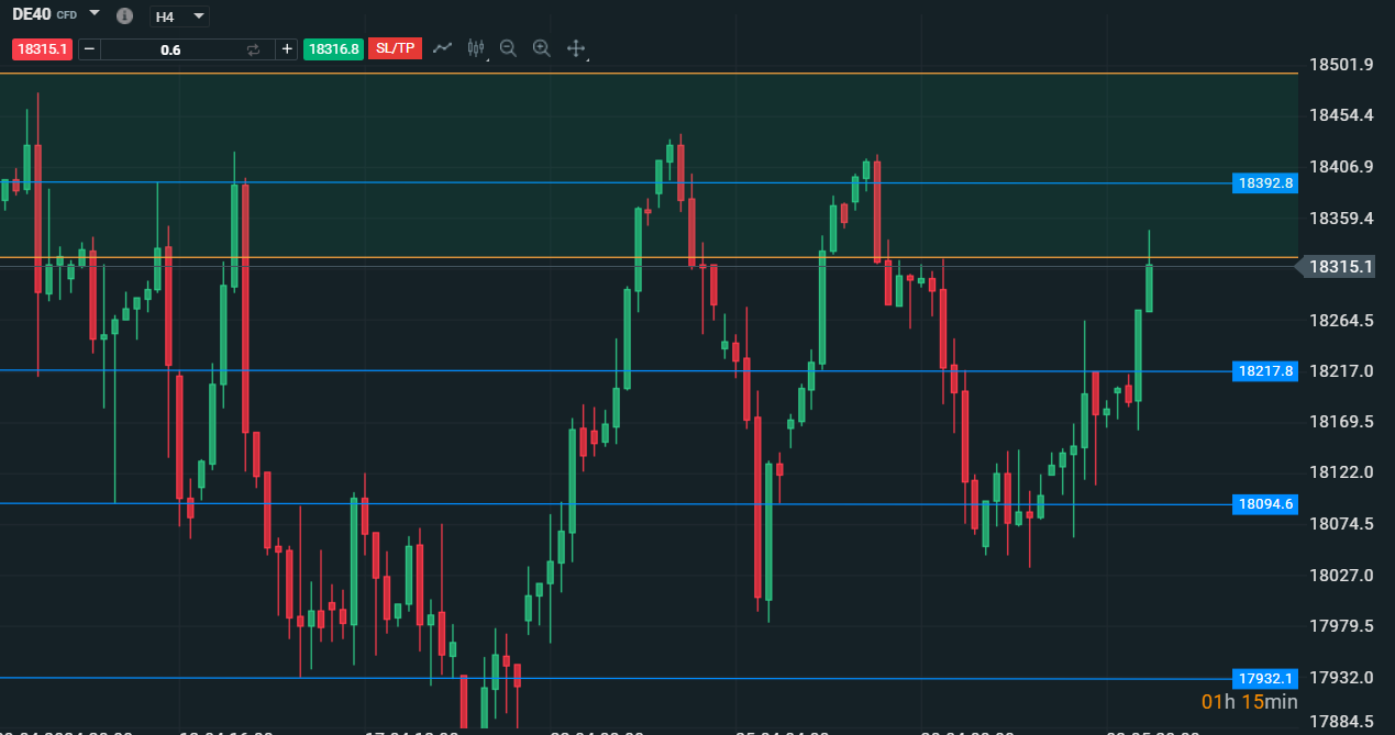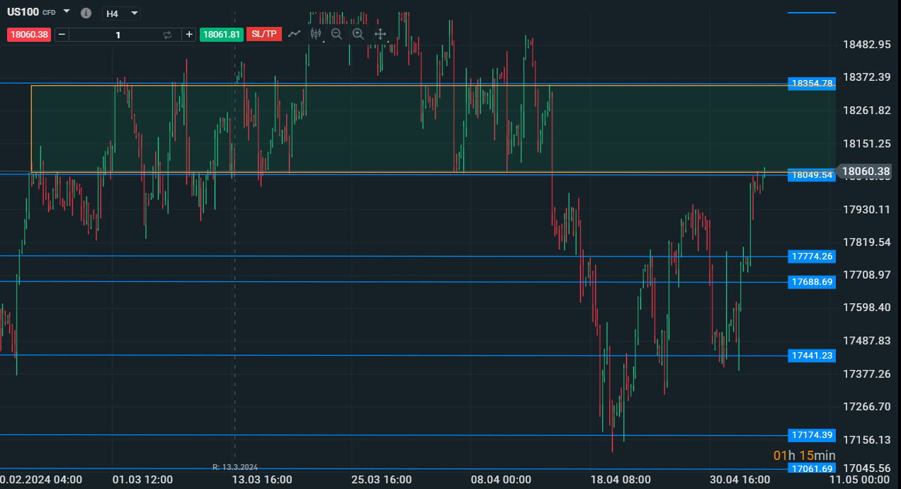 Siamo entrati su base 4 ore in zona di ex-supporto, il tutto prima dell'apertura del cash. Al momento potremmo aspettarci una fase di test di quest'area, ossia i 18050-18100 per poi vedere un possibile ritracciamento in linea con la dinamica dominante sul timeframe mensile. Al momento vediamo una fase di forte recupero sia sull'Europa che sugli Usa, una fase insolita dopo i bruttissimi dati visti nella giornata di venerdí che aprono le porte ad un possibile ribasso dei tassi in Usa prima del previsto. Al momento quindi c'é questa fase di test sui massimi.