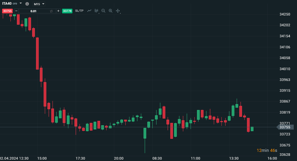 La situazione statica del Ftse Mib in mattinata su base 15 minuti - Fonte: XStation