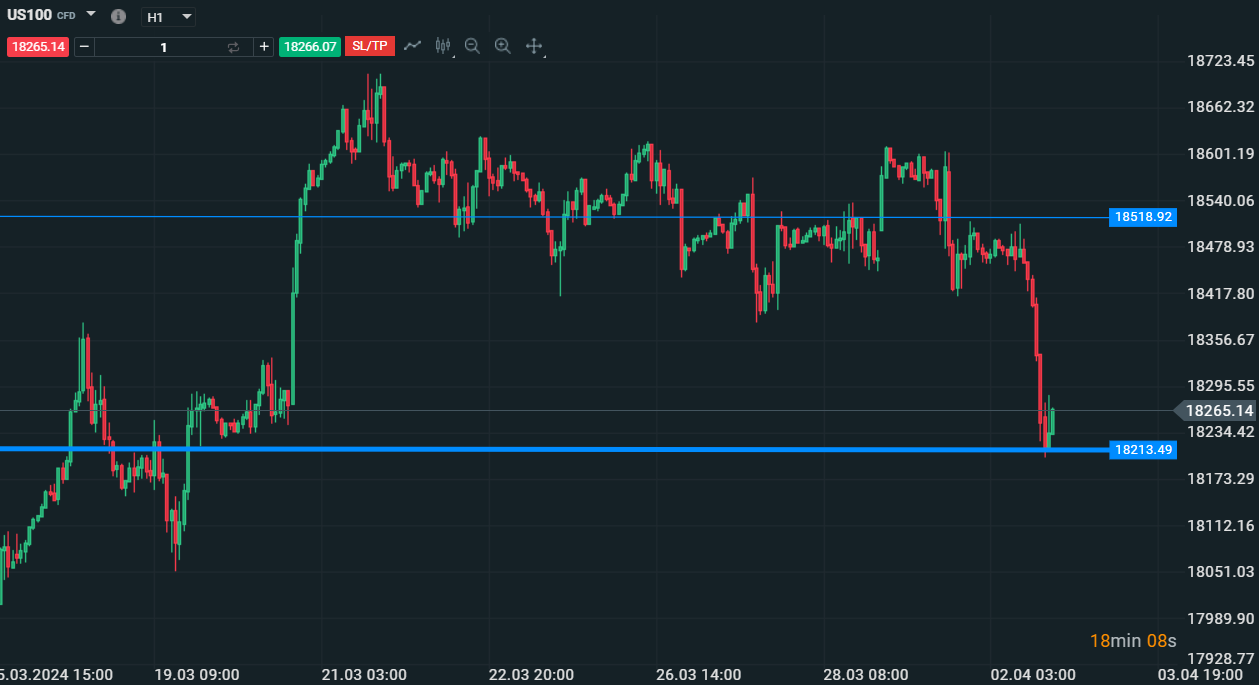 Nasdaq su base oraria e il range compreso tra 18500 e 18200 interessato dal movimento di oggi - Fonte: XStation
