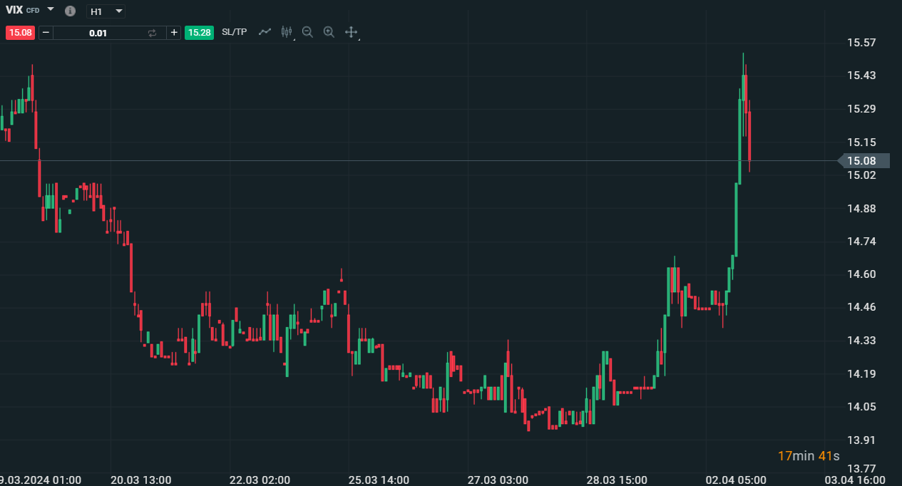 Grafico VIX su base oraria e il forte rialzo di oggi - Fonte:XStation
