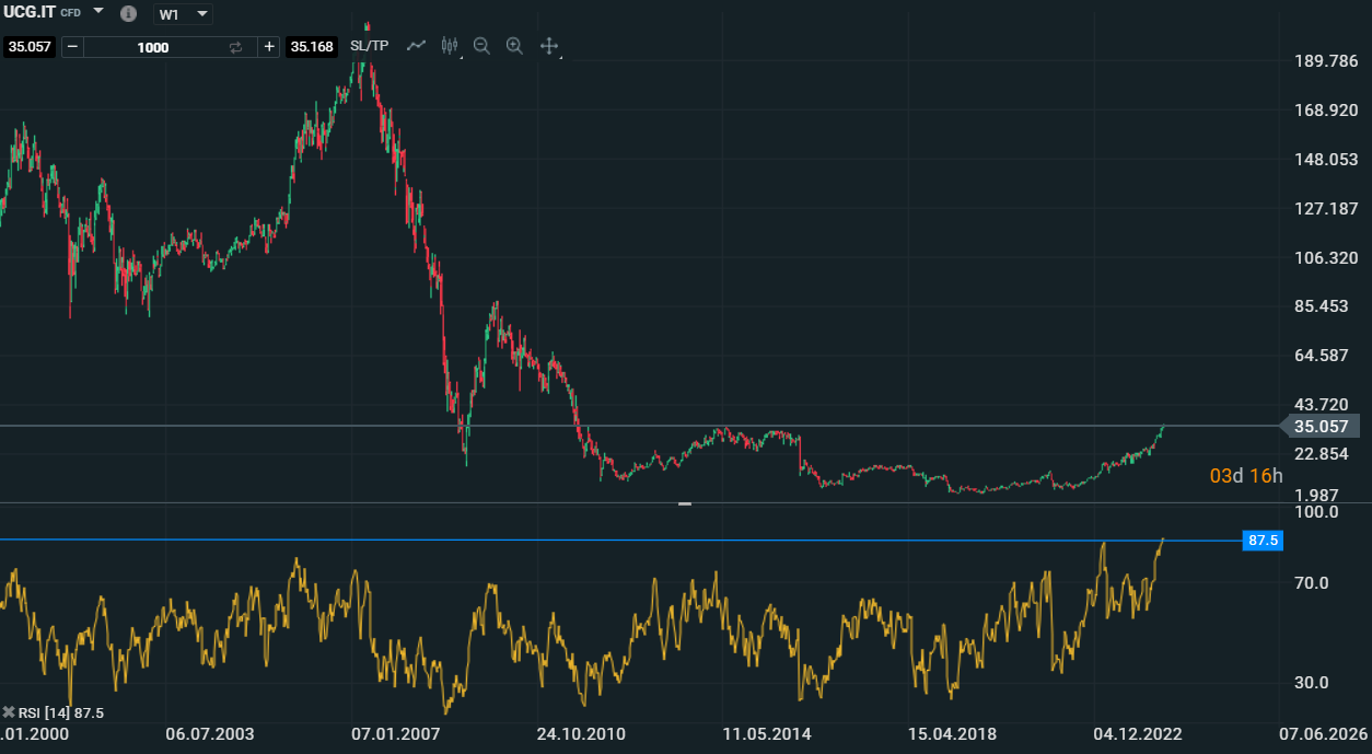 Iniziamo a considerare delle situazioni che risultano interessanti anche su titoli singoli e questa volta é il turno di uno dei cardini del Ftse Mib, il titolo Unicredit. Il titolo ha mostrato, cosí come la maggior parte dei bancari italiani, una forza eccezionale al rialzo con progressi a doppia cifra da inizio anno e rialzi a tripla cifra se prendiamo in considerazione tutto il 2023. Dato l'andamento molto consistente al rialzo, é doveroso paragonare la situazione tecnica del titolo con l'indice di riferimento e in tal merito possiamo notare come Unicredit, su base settimanale, abbia di recente registrato il suo record storico sull'ipercomprato dell'oscillatore RSI setup standard a 14 periodi. Al momento il record vede l'RSI a 87,5 mentre il precedente record si rifa a febbraio del 2023 a ridosso degli 86. In quel caso il titolo scese di circa il -24% in qualche settimana per poi riprendere il trend di lungo al rialzo, ad oggi abbiamo giusto timidi segnali di debolezza come nel caso di ieri con l'indice che ha chiuso a ridosso del -1% mentre il titolo ha registrato giusto un semplice ritracciamento dell'ordine del -0,10%. Attenzione quindi a possibili ribassi sul titolo che in questo momento si trova in una condizione di forza fin troppo eccezionale.