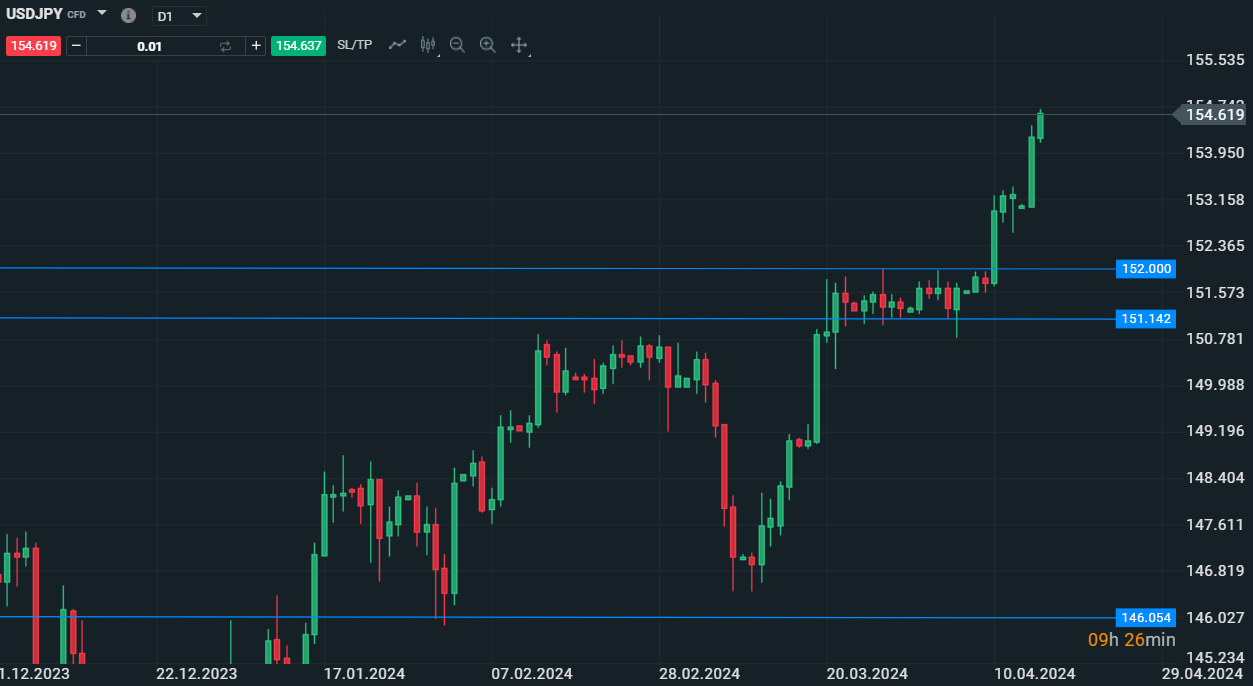Grafico di UsdJpy su base giornaliera che punta verso i 155 - Fonte:XStation