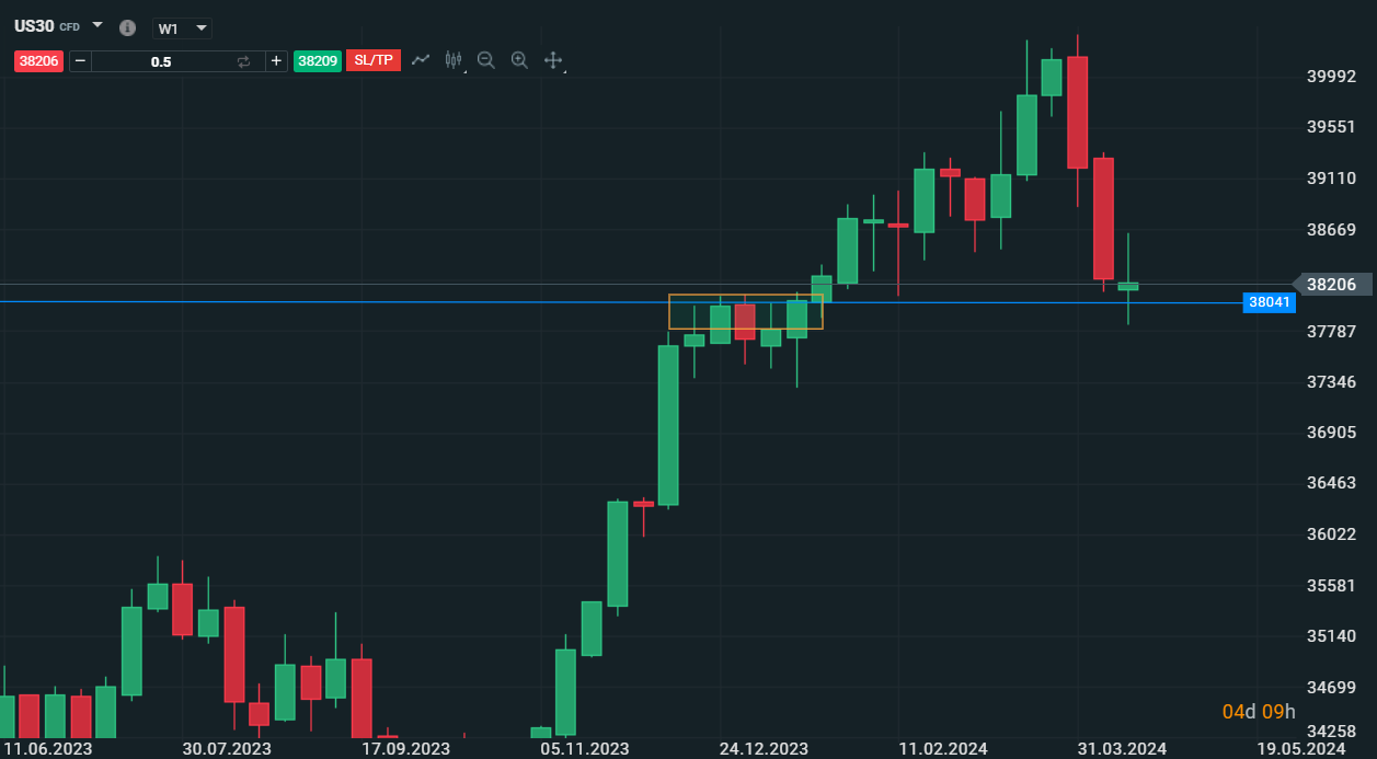 Grafico settimanale di Dow Jones che affronta una zona di supporto-resistenza evidenziata tra 2023 e 2024 - Fonte:XStation