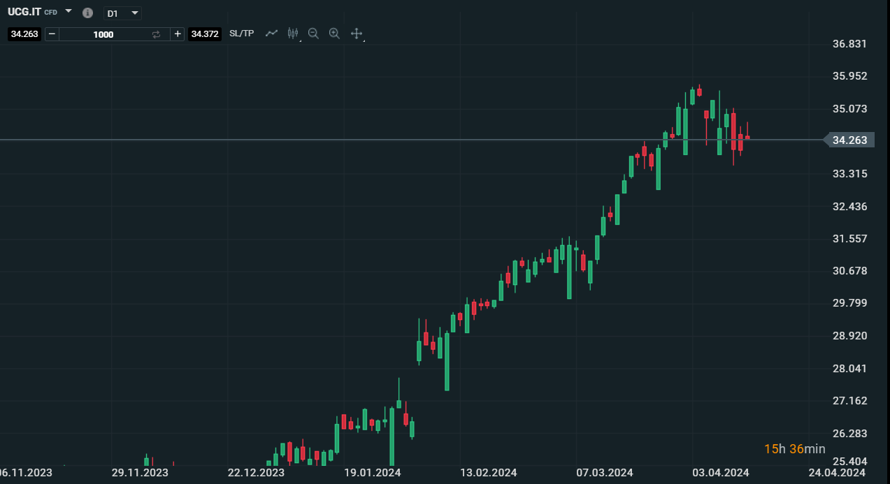 Dinamica giornaliera di Unicredit in fase di indebolimento - Fonte:XStation