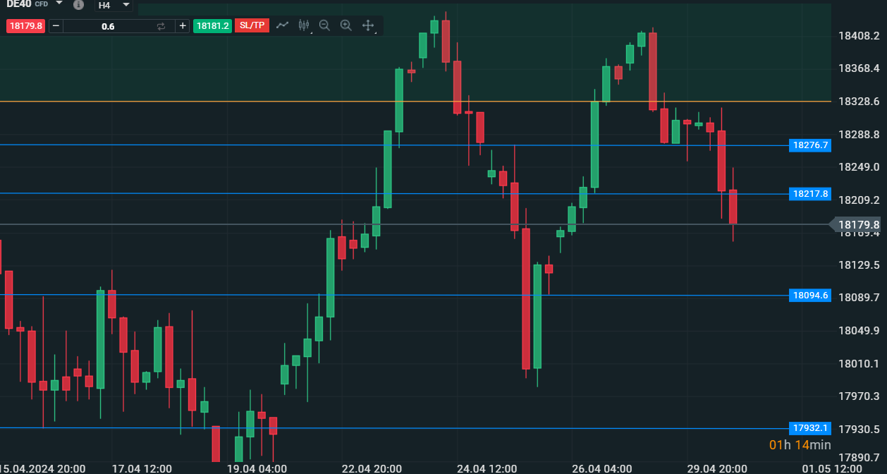 Grafico di Dax base 4h con rottura dei minimi overnight e proseguimento della dinamica di ribasso - Fonte:XStation