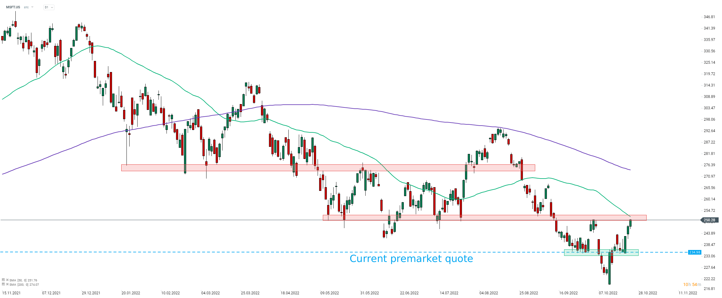 Il grafico Microsoft (MSFT.US) sembra sorprendentemente simile al grafico Alphabet. Il titolo è inoltre salito ieri per testare la zona di resistenza contrassegnata dalla precedente reazione dei prezzi e dalla media mobile a 50 sessioni (linea verde). L'attuale quotazione pre-mercato suggerisce che un test dell'area di oscillazione di $ 235,00 verrà effettuato all'inizio della sessione di Wall Street di oggi. Una recente correzione al rialzo non è riuscita a superare un massimo locale all'inizio di ottobre, il che significa che la struttura del trend ribassista su Microsoft è rimasta intatta.
