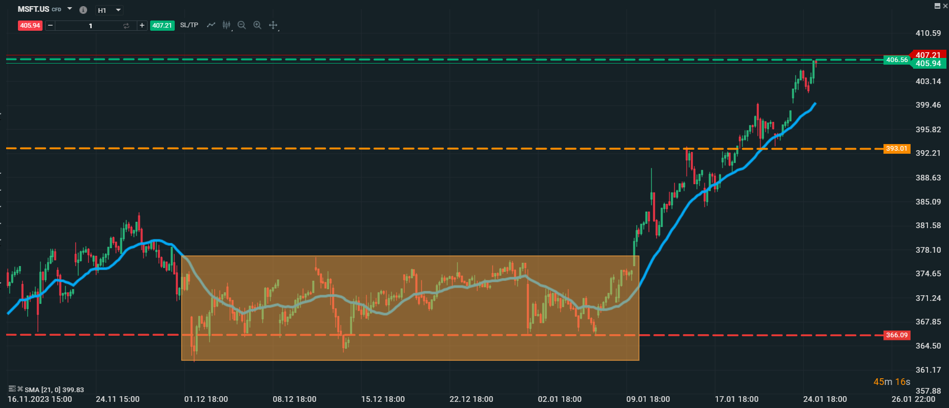 Nonostante questa notizia, il prezzo delle azioni ha esteso il movimento al rialzo e ha superato la soglia di 400 mentre al momento si aggira intorno a 405. Resta da vedere se il movimento al rialzo continuerà o se inizierà una correzione. Fonte. xStation