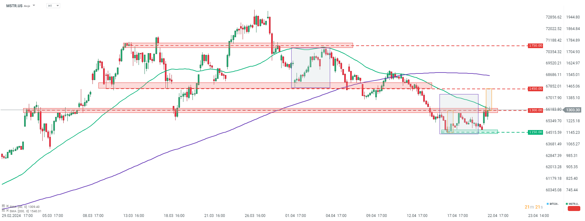 MicroStrategy (MSTR.US) e altri titoli statunitensi legati alle criptovalute vengono scambiati in rialzo oggi. Il dimezzamento dei Bitcoin è stato completato questa settimana e in futuro comporterà una riduzione dell'offerta di Bitcoin. Da un punto di vista fondamentale, ciò dovrebbe sostenere il prezzo della moneta e quindi fornire una spinta alle aziende, la cui valutazione è legata al Bitcoin. Tuttavia, questo è più un effetto a lungo termine. Gli effetti a breve termine del precedente halving di Bitcoin sono stati meno chiari. Tuttavia, poiché l’evento più recente non ha portato ad alcun movimento importante sul mercato Bitcoin, e la moneta continua costantemente a muoversi in ripresa, le azioni crittografiche ne traggono vantaggio.
