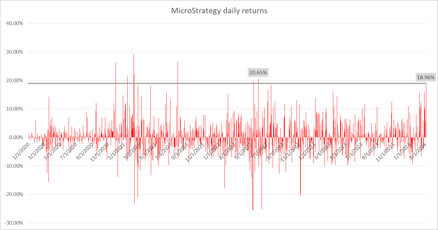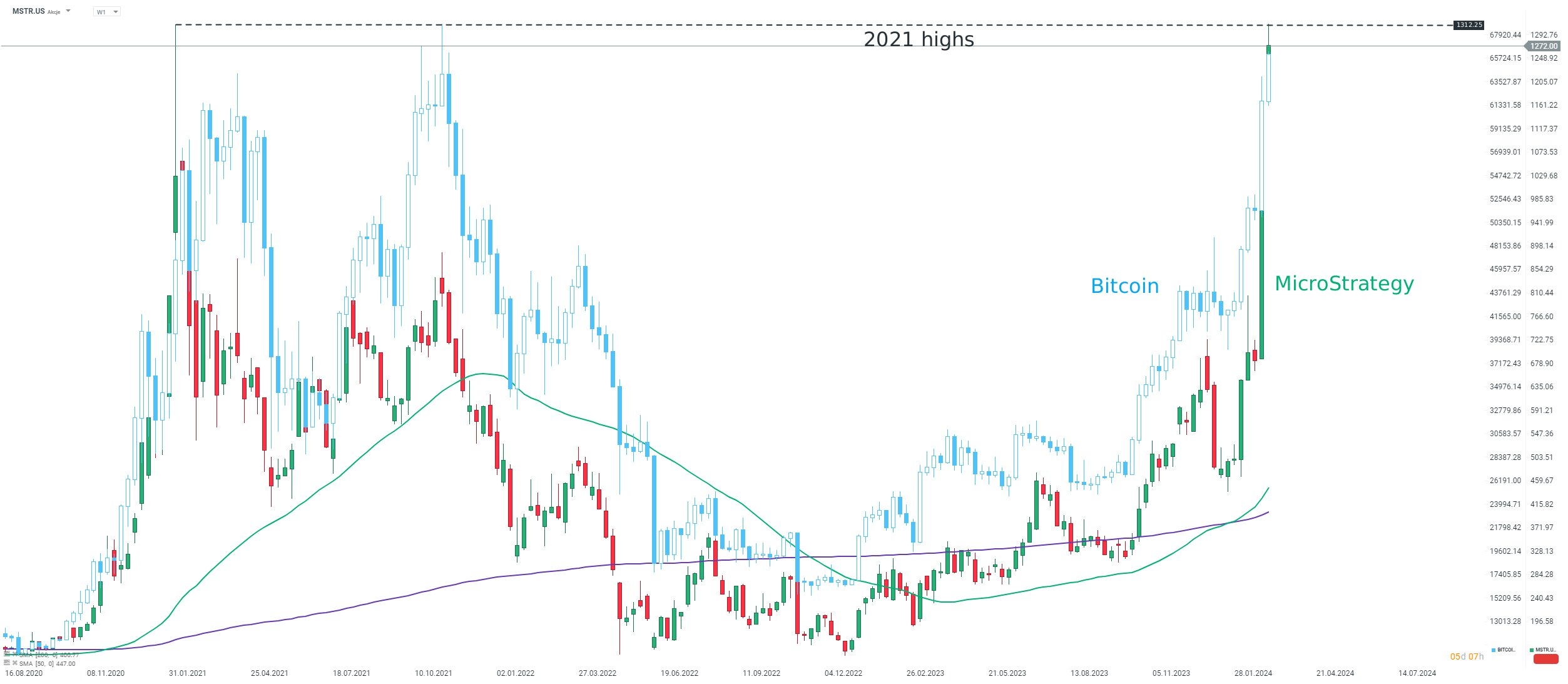 MicroStrategy (MSTR.US) è salita di circa il 19% e oggi ha addirittura superato i massimi del 2021 per un breve periodo. Fonte: xStation5