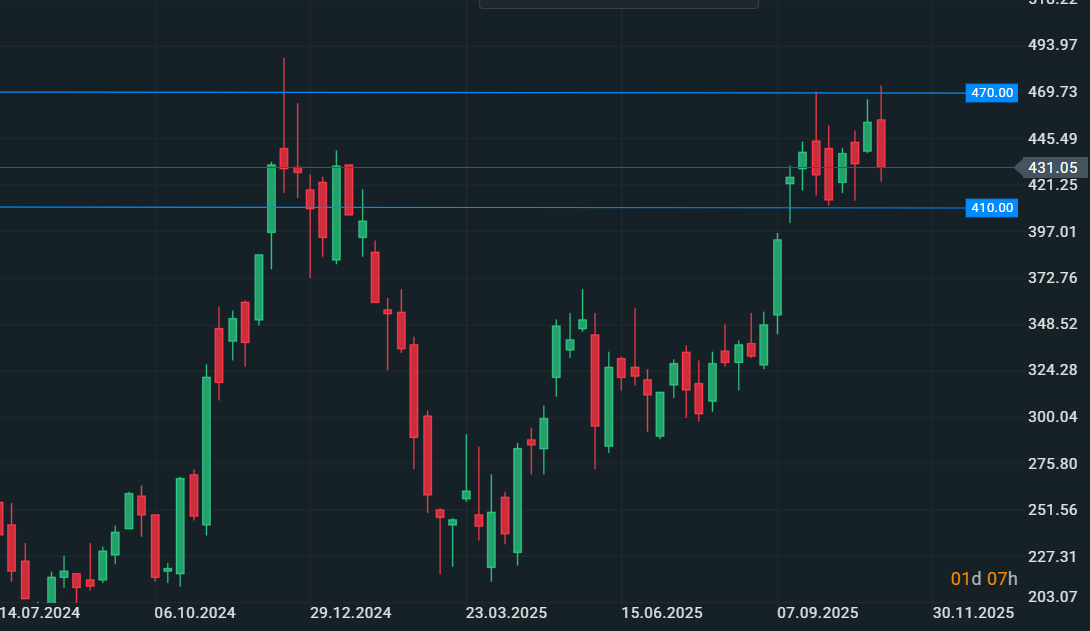 Grafico Settimanale di Tesla con livelli evidenziati sulla resistenza in area 470 dollari e il supporto fondamentale in area 410 dollari - Fonte: XStation - Studio: David Pascucci