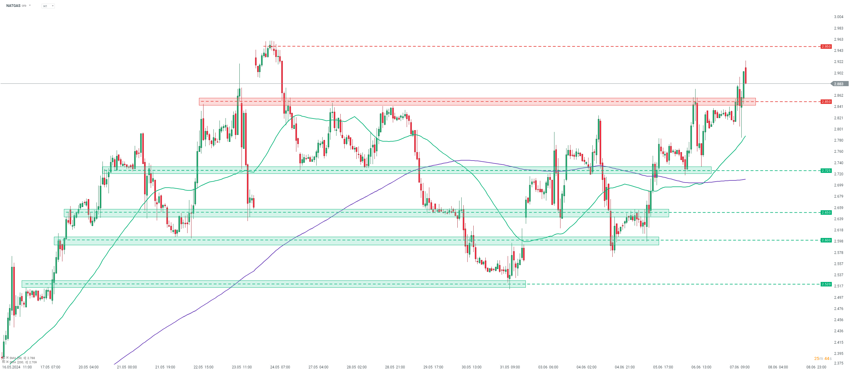 Dando un'occhiata al grafico NATGAS nell'intervallo H1, possiamo vedere che il prezzo è salito sopra i $ 2,85 per zona di resistenza MMBTu oggi e ora viene scambiato oltre il 15% al di sopra del minimo locale dalla fine di maggio. Oggi è stato raggiunto un massimo giornaliero superiore a $ 2,92, ma il prezzo si è leggermente ritirato. Ciononostante, NATGAS continua a essere scambiato in rialzo del 3% nel corso della giornata. La prossima potenziale zona di resistenza da tenere d’occhio si trova nell’area di 2,95 dollari, contrassegnata dai massimi di fine maggio.