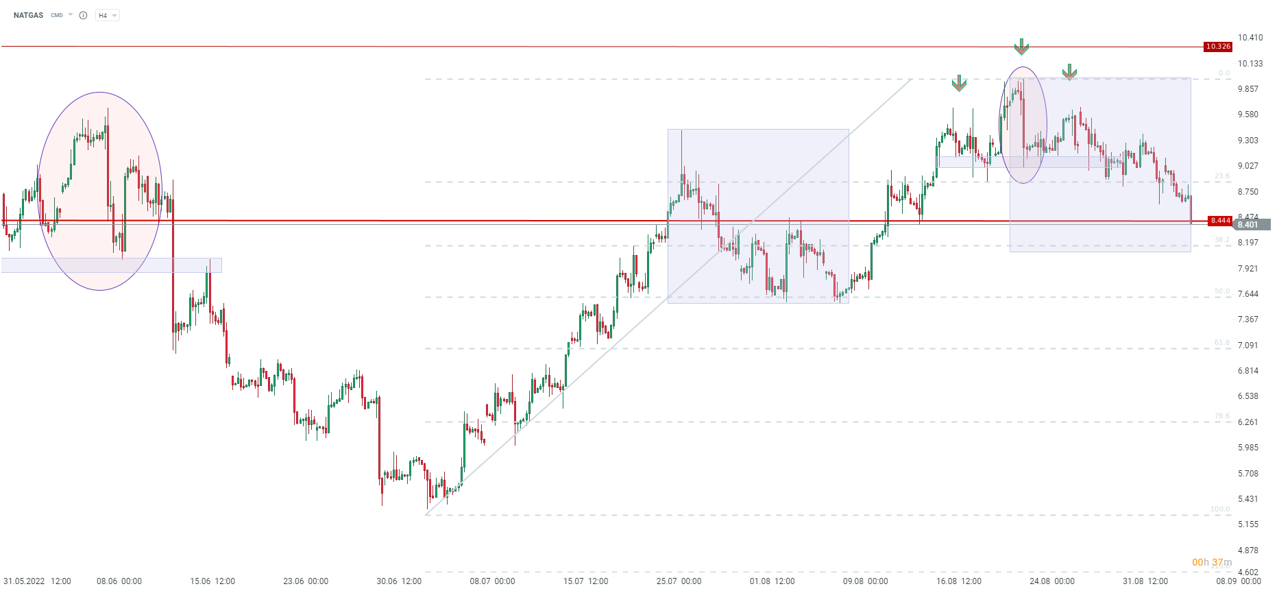 Dal punto di vista puramente tecnico, il gas potrebbe testare l'area intorno al livello di 8,2, dove si trova il 38,2% del ritracciamento e il range della precedente correzione del trend. Inoltre, si sta realizzando il precedente schema testa e spalle, sebbene la realizzazione stessa sia alquanto lenta. Se la zona a 8,2 viene superata, il prezzo potrebbe scendere in prossimità di 7,6 al 50% del ritracciamento. Fonte: xStation5