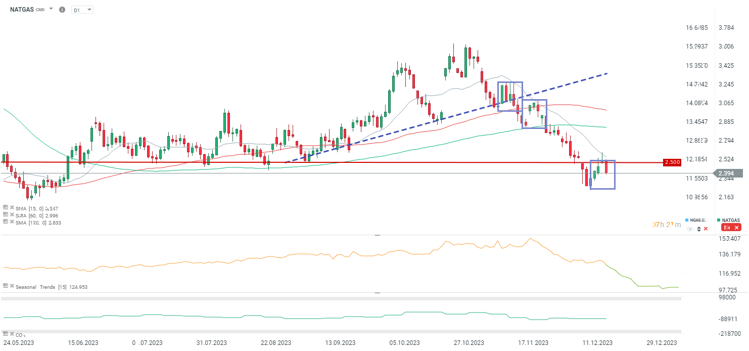 NATGAS scende di circa il 5% oggi, con il prezzo che tenta di scendere al di sotto di $ 2,40 per MMBTu. I modelli stagionali indicano la possibilità che il movimento al ribasso duri fino alla fine dell’anno. Un supporto chiave a breve termine può essere trovato nell’area 2,25 dollari, seguito dai supporti a 2,14 dollari e 2,00 dollari.