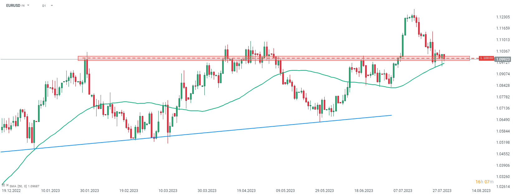 EURUSD è salito dopo la chiusura della sessione di Wall Street e dopo il declassamento di Fitch. Tuttavia, da allora la coppia ha invertito tutti i guadagni e ora sta tentando di superare la zona di supporto a 1,10. Fonte: xStation5