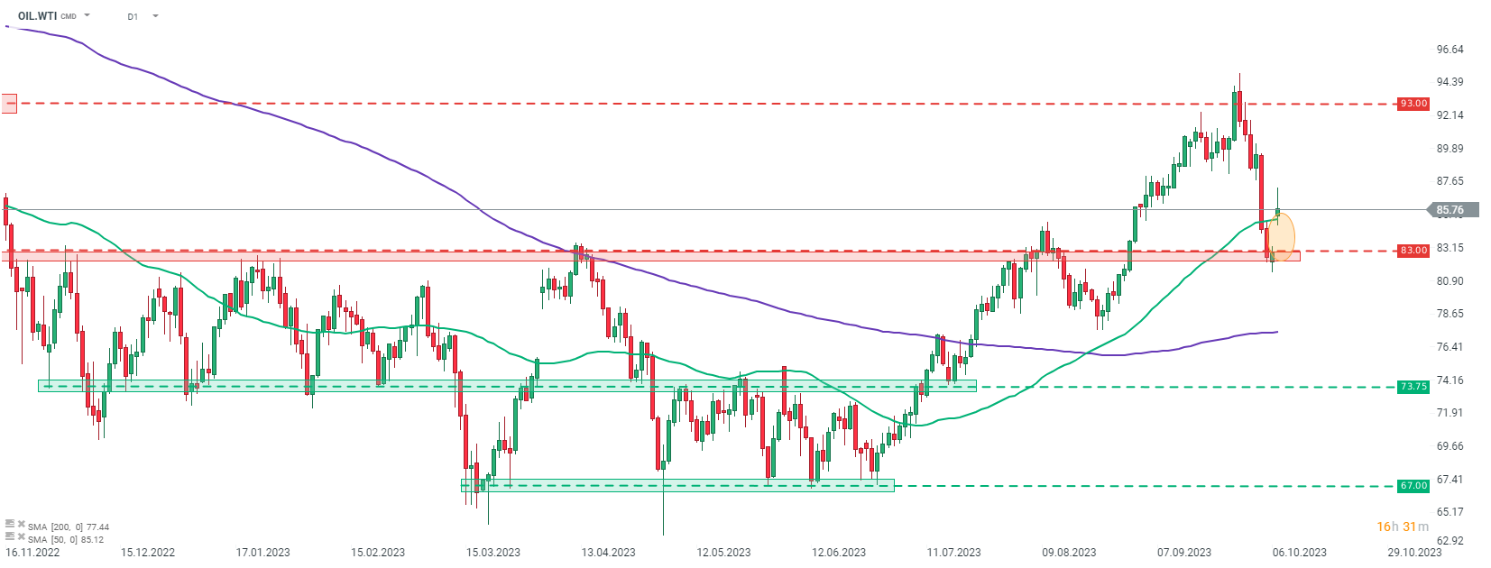 Il WTI (OIL.WTI) è rimbalzato dalla zona dei prezzi degli 83 dollari, segnando il limite superiore della precedente zona di resistenza. Oggi i prezzi del petrolio sono aumentati del 3-4% in risposta alla situazione in Medio Oriente. Fonte: xStation5