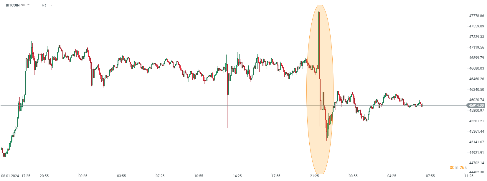 BITCOIN si è stabilizzato in seguito ai movimenti volatili di ieri innescati dal falso tweet della SEC sull'approvazione dell'ETF spot di Bitcoin. Fonte: xStation5