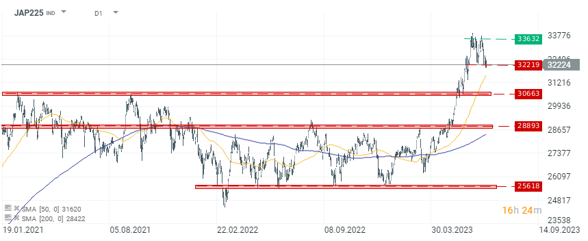 Il Nikkei giapponese (JAP225) ha formato un modello doppio massimo a 33.600 punti, ha perso slancio al rialzo ed è tornato al livello di supporto a 32.200 punti., Grafico D1, fonte xStatin 5.